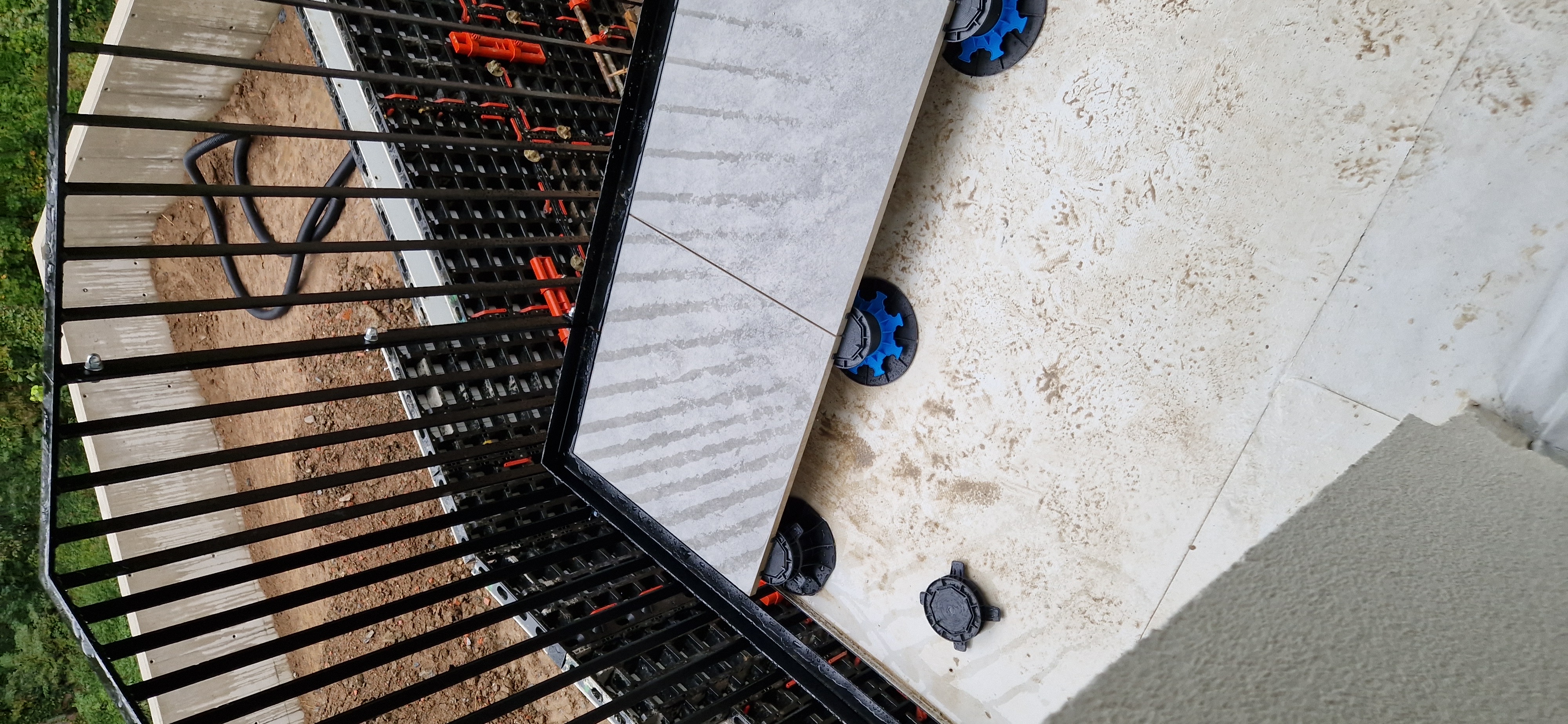 - Provádíme pokládku dlažby na terče – ideální řešení pro terasy, balkony a komerční plochy.